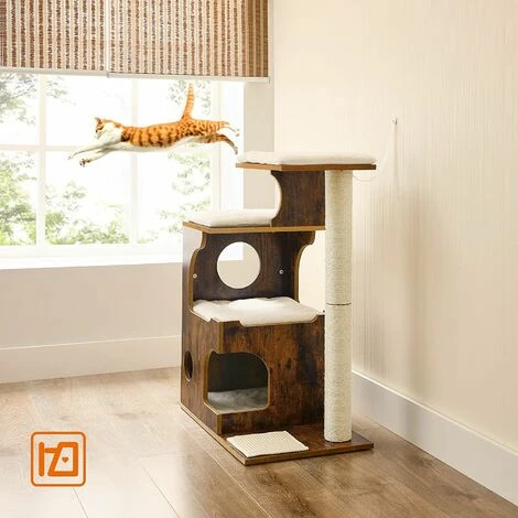 1. POUR DES CHATS PROPRES ET CÂLINS: Les coussins douillets en tissu style ours en peluche sont attachés aux plateformes et dans le chalet par des bandes auto-agrippantes. Ils sont également faciles à enlever et à nettoyer
