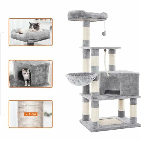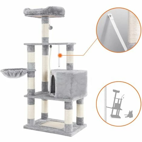 De nombreuses possibilités sont offertes: les griffoirs sur les poteaux et le socle, la niche, le panier suspendu, et les surface de couchage. De plus, un jeu de pêche classique est conçu pour que votre chat puisse se divertir.