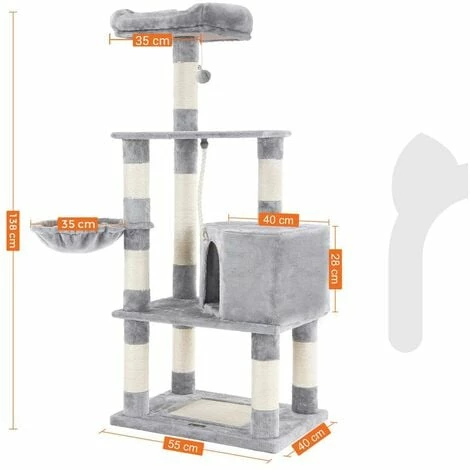 Avec une hauteur de 138 cm, l’arbre d’une hauteur amicale s’adapte bien aux félins pour jouer et s’allonger. Dimensions:55 x 40 cm, il offre beaucoup d’espace et s’adapte à toutes les pièces