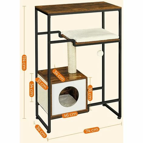 Étagère de rangementPlacer une plante ou une dĂ©coration sur le dessus de 74 x 34 cm pour exploiter au mieux l’espace. | Tapis en tissu pelucheLes tapis tout doux dans la niche et sur la plate-forme offrent aux chats un environnement confortable pour jouer Ă cache-cache et prendre un bain de soleil. | Un poteau enveloppĂ© de sisalLe poteau enveloppĂ© de sisal offre aux chats un endroit oĂą aiguiser leurs griffes et protège les meubles des coups de pattes. |