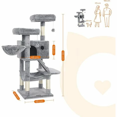 - Le confort à chaque pas : Cet arbre à chat de 135 cm est entièrement recouvert d’un tissu peluche de 500 g/m² (plus dense et confortable que la normale !). Afin que vos chats se sentent à l’aise dès le premier pas dans leur nouvelle maison !