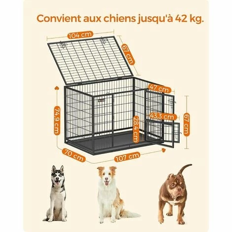 - Choisir une cage adaptée : Cette cage de 107 x 70 x 74,9 cm convient aux chiens entre 32 et 42 kg. Races recommandées : Border Collie, Bouledogue américain, Husky et plus encore. Veuillez regarder les méthodes de mesures dans les précautions