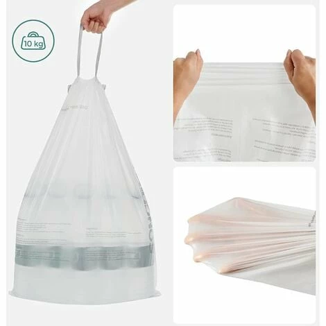 Poignées pratiquesChaque sac poubelle est équipé de poignées à cordon pour le fermer et le sortir facilement. | S’adaptent parfaitementLeur taille parfaite les empêche de tomber ou de dépasser pour garder votre cuisine en parfait état. | Pas de mauvaise odeurFabriqués en plastique HDPE de qualité supérieure, les sacs poubelles sont inodores et ne gênent pas les nez sensibles. |