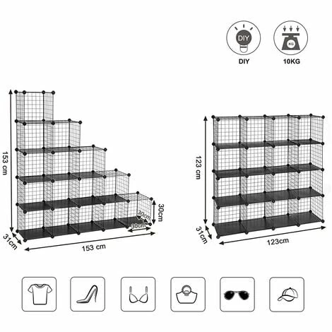 - STABILITÉ EXCEPTIONNELLE: Constituée de panneaux en PP et de treillis métalliques. la charge maximale de chaque cube est de 10 kg. Vous pouvez assembler ou démonter selon vos besoins. L’armoire peut être fixée au mur grâce au ruban anti-renversement(vis et boulons d’expansion)