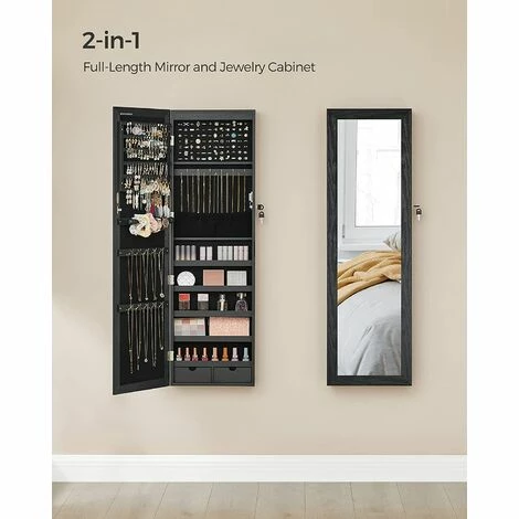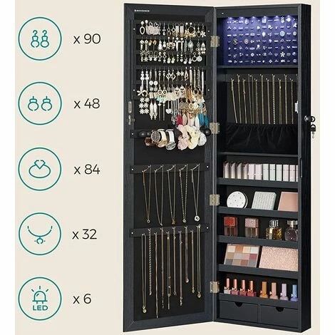 - Remplissez-la de trésors : Après une longue journée, enlevez vos bagues, vos boucles d’oreilles et vos colliers et placez-les à l’intérieur de cette armoire à bijoux. 84 emplacements pour bagues, 90 fentes pour boucles d’oreilles, 48 trous pour clous, 32 crochets pour colliers, 5 étagères, 2 tiroirs et 1 barre pour bracelets sont prêts à tous les accueillir !