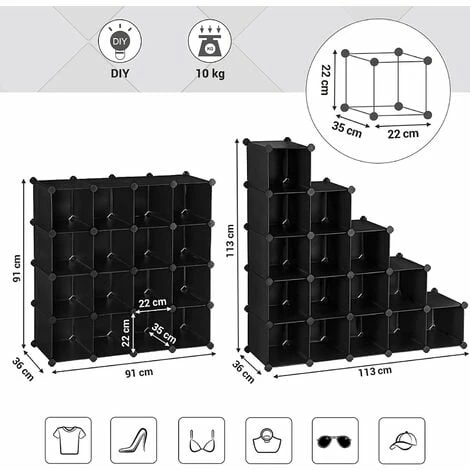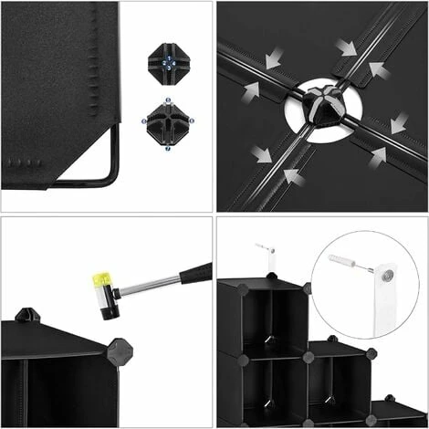 3.La qualité, notre priorité : Avec des connecteurs ABS de qualité, un cadre métallique robuste et des panneaux en polypropylène noirs intemporel étanches et faciles à nettoyer, chaque compartiment de 22 x 35 x 22 cm (L x l x H) supporte jusqu’à 5 kg. En plus, des kits anti-basculement sont fournis pour plus de sûreté