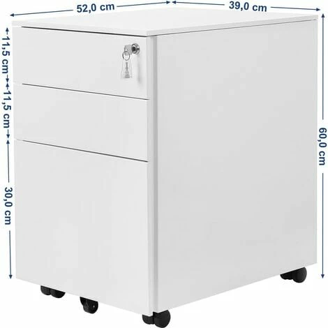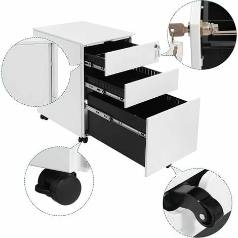 4. CAISSON VERROUILLABLE À ROULETES: Grâce à la serrure, les 3 tiroirs peuvent être verrouillés en toute sécurité. Les roulettes pivotent sur 360° et permettent de déplacer l’armoire où bon vous semble. Sa taille lui permet de se loger sous le bureau