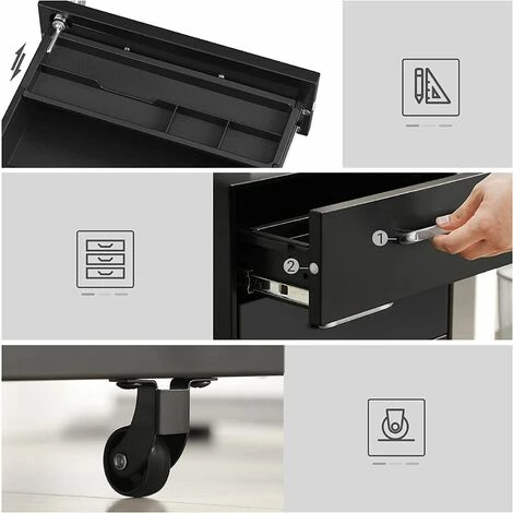 VerrouillableLes documents importants peuvent être rangés en toute sécurité dans le tiroir du haut à l’abri des mains indiscrètes ou à l’abri des enfants pas sages. | Glissières en douceurLes glissières durables à pleine extension vous permettent de tirer les tiroirs complètement et en douceur, même entièrement chargés, pour un accès pratique aux fichiers. | 3 Types de roulettesCe caisson est équipé de 4 roulettes, dont 2 avec freins pour le maintenir en place. 1 roulette en plus se trouve sous le tiroir du bas pour plus de stabilité. | Un porte-papeterieIl vous aide à faciliter le rangement des petits objets dans les tiroirs et peut être retiré et déplacé selon vos besoins. |