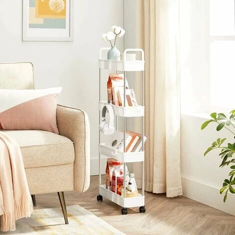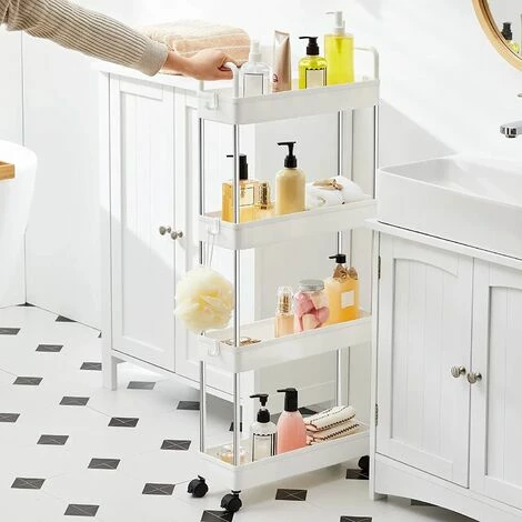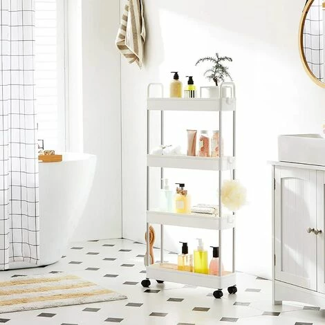 3.RĂ©sistance pour le rangement : Ce chariot est fait pour durer, bien qu’il soit fin. Chaque niveau supporte jusqu’Ă 5 kg, idĂ©al pour ranger des snacks et des boissons, des shampoings, des gels douche, ainsi que des liquides lessive et de javel