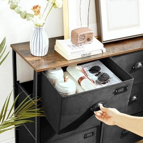 Avec étiquettesElles vous aident à trier et à retrouver rapidement ce dont vous avez besoin. | RenforcementDes barres de renforcement à l’arrière assurent une structure plus stable. | Charme rustiqueAvec des devants en tissu suédine, des poignées semi-circulaires et un cadre en métal, ce meuble rustique apporte du charme à votre intérieur. | Kit anti-basculementAvec le kit anti-basculement inclus, vous pouvez fixer cette commode au mur pour une utilisation plus sûre. |