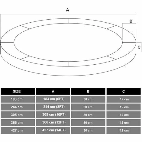1. Tailles standards – Nos coussins de protection ont des mesures standards: 6FT 183 cm/ 8FT 244 cm/ 10FT 305 cm/ 12FT 366 cm/ 14FTV1 427 cm , ils sont ainsi compatibles avec les trampolines de différentes marques