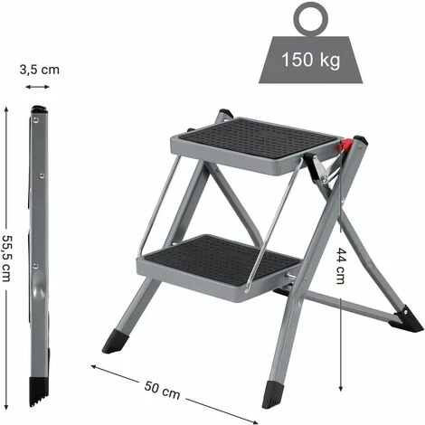 - TRANSPORT FACILE AVEC POIGNÉE : L’escabeau plié a une taille de 50 x 3,5 x 55,5 cm et pèse 3,5 kg. Il est facile à transporter grâce à sa poignée. Lorsqu’il n’est pas utilisé, il peut être placé dans un coin du garage pour gagner de la place