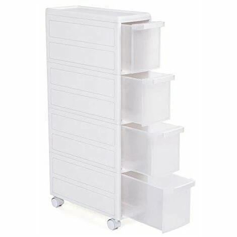 Nombre d’étagères ajustable – en fonction de l’espace disponible ou de vos besoins, vous pouvez assembler 2, 3 ou 4 étagères, et utiliser les tiroirs séparément. Gain de place de rangement – cette étagère vous permet d’optimiser les petits espaces à côté de l’évier, des toilettes, de la machine à laver, du frigo, du canapé, du lit ou du plan de travail. Ce meuble d’appoint est profond et haut, les affaires se rangent facilement dans les 4 tiroirs de grande capacité et sur le plateau supérieur. (largeur: 18 cm, profondeur: 46 cm, hauteur: 84,5 cm) assemblage simple & emballage complet – pas d’outil nécessaire, l’assemblage se fait en un clin d’œil. L’emballage de protection assure l’arrivée du produit intact chez vous. Déplacement facile – grâce aux roulettes pivotantes à 360°, ce meuble de rangement est facile à déplacer. Cela vous permet de nettoyer les coins et les petits espaces. Polyvalence – sa finition blanche le rend compatible avec la plupart des styles de décoration. Vous pouvez mettre cette étagère dans votre cuisine pour ranger les pots d’épices, les boîtes de conserve, les rouleaux d`essuie-tout, ou la placer dans votre salle de bain pour y ranger des shampoings, des gels douche, des serviettes, ou encore l`installer dans vos toilettes pour y ranger le papier toilette, les gels ou les désodorisants wc. | Livraison gratuite sous 2 à 5 jours ouvrés. Garantie 2 ans pièce mains d’œuvre et déplacement. PAS DE LIVRAISON EN DOM-TOM