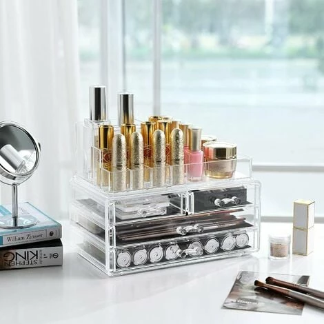 3.Très fonctionnel, une merveille en matière de stockage – ce meuble de rangement peut accueillir une grande variĂ©tĂ© d’objets. Le prĂ©sentoir du haut contient 11 compartiments avec des hauteurs et tailles diffĂ©rentes pour ranger vos rouges Ă lèvres, vernis Ă ongles, pinceaux Ă maquillage, mascara, crayons Ă sourcils, eye-liner, etc.tandis que vos bijoux ou diffĂ©rents outils de maquillage de tailles diffĂ©rentes trouvent leur place dans les six compartiments du prĂ©sentoir du bas oĂą ils sont par ailleurs protĂ©gĂ©s de la poussière.