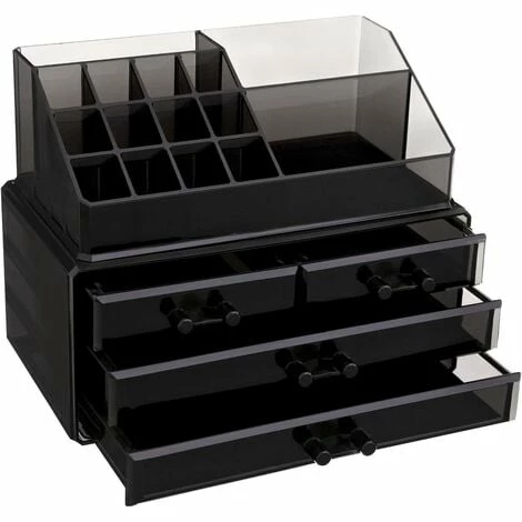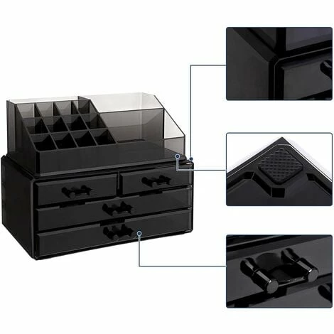 3.Grande capacité – 4 tiroirs avec les dimensions différentes pour ranger vos bijoux, le poudre, lingettes démaquillantes, etc. Un tissu de fibre amovible est fourni pour chaque tiroir afin de protéger vos bijoux contre les rayures et garder la proprété de votre tiroir. L’étage supérieur a été divisé en 15 compartiments des profondeurs différentes ( 3cm,5,5cm et 5,5cm) pour vos brosses, rouge à lèvres, MASCARA, pinceaux, crayons, etc