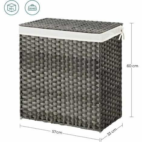 D’une dimension de 57 x 33 x 60 cm (L x l x H), ce panier à linge SONGMICS de 110L accueille vos vêtements à laver. Le sac amovible attaché au panier reste fortement accroché. Les poignées facilitent son transport.