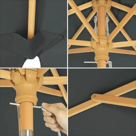 2.Force et beauté : Le mât en bois de hêtre dont les 2 parties sont maintenues fermement ensemble par un raccord en alliage et les 6 baleines en bois donnent à la toile et à votre terrasse un effet frais et naturel
