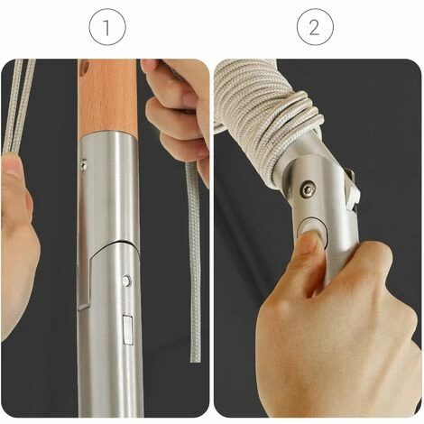 5.Que devez-vous faire ? Vissez la partie supérieure du mât à la partie inférieure, fixez le mât à un socle (non inclus), tirez sur la corde pour ouvrir le parasol et vous serez déjà en train de vous rafraîchir sur votre terrasse !