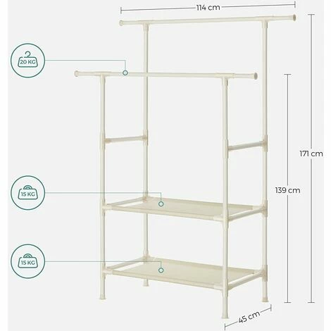 Pour des matins plus calmes : Le matin, vous perdez combien de temps à choisir et à assortir vos vêtements ? Il est grand temps d’opter pour ce porte-manteau blanc pratique ! Les 2 barres de suspension robustes et une étagère à 2 niveaux vont vous simplifier la vie ! Avec ce portant, profitez-en pour mettre de l’ordre dans vos chemises, vos robes, vos manteaux, vos sacs et même vos chaussures. Assortissez tout à l’avance pour mieux commencer la journée !