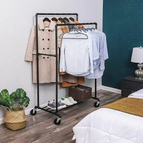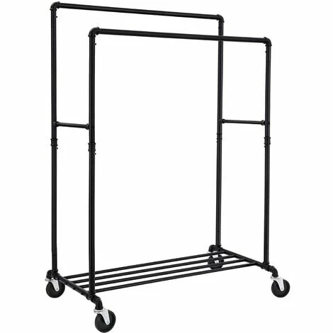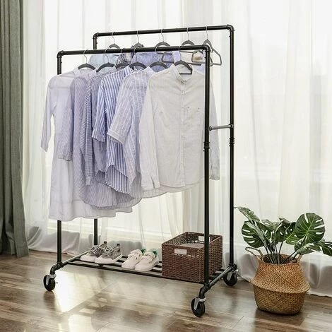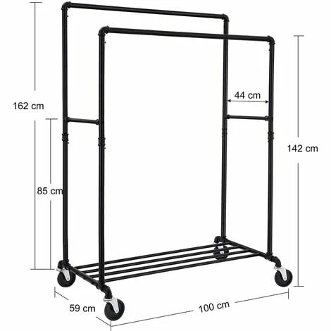 Conception en tube industrielLes coudes métalliques aux extrémités de la barre de suspension empêchent efficacement les vêtements de se glisser. La conception en tube rétro, comme un excellent look, mettant pleinement en valeur cet article pour un usage domestique et commercial. | Beaucoup plus d’espace pour accrocher vos vêtementsL’intervalle des deux barres est de 44 cm, ce qui permet de suspendre deux rangées de vêtements. | Une robuste étagère de rangementL’espace de stockage inférieur se compose de 4 barres transversales avec une charge max de 15 kg, conçu pour ranger les chaussures, les boîtes de rangement, etc. |