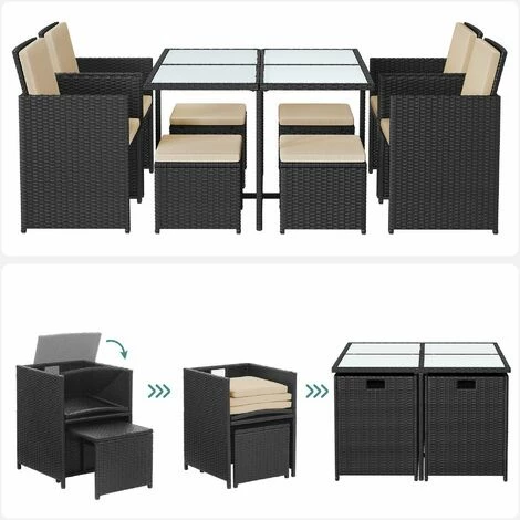 Offre beaucoup plus que ce qu’il ne prend : Cet ensemble de 9 meubles ne prend la place que d’une seule table ? C’est exact ! Grâce Ă la conception intelligente, les repose-pieds se glissent sous les fauteuils et les fauteuils se glissent sous la table. Facile Ă ranger, l’ensemble prend très peu de place lorsqu’il n’est pas utilisĂ© !