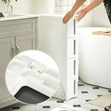 - 4 tiroirs : 4 tiroirs profonds offrent de quoi ranger jusqu’à 28L. Comparé aux étagères en bois ou en métal, celle-ci en plastique PP vous aide à dire adieu à la moisissure et à la rouille, même dans votre salle de bain !