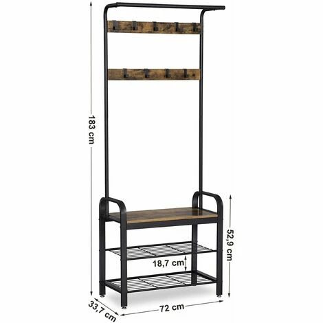 3.Paradis pour chaussures : Voilà 9 crochets et 1 tringle dans la partie supérieure et une étagère à 2 niveaux pour les chaussures en bas. Asseyez-vous sur le banc et mettez vos chaussures confortablement avant de partir !