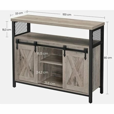 Ajouter du caractèreLe cadre en métal et les panneaux grillagés des 2 côtés sont conçus pour donner une touche industrielle supplémentaire. | Portes de grange pas comme les autresLes portes de grange de style rustique ajoutent encore plus de caractère. Ouvrez les portes pour découvrir ce qui se cache derrière. | Préparez des boissons pour vos invitésDu café, du thé, des sodas ou des jus ? Préparez-les sur la grande surface de ce buffet. |