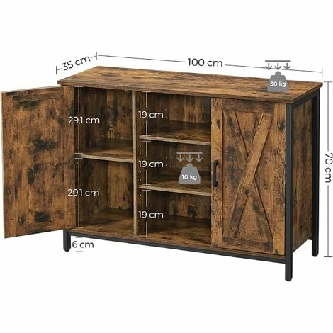 Portes élégantes façon grangeLes portes façon grange rustiques marrons avec poignées en métal ajoutent une touche campagnarde au design industriel. | De quoi ranger ? Oui !En plus de la surface spacieuse, voilà 3 compartiments ouverts au milieu et une étagère réglable derrière chaque porte. | Saveur rustiqueD’un ton brun rustique chaud, ce meuble a la saveur que de nombreuses pièces voudraient goûter. |