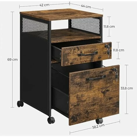 Grilles latéralesElles empêchent les objets de tomber du compartiment ouvert et ajoutent plus de style industriel au caisson. | Tiroirs verrouillablesLes 2 tiroirs peuvent être fermés à clé pour protéger vos objets des mains indiscrètes. | Cinquième roueUne roulette maligne dessous permet au caisson de bien tenir debout lorsque le tiroir du bas est grand ouvert. |