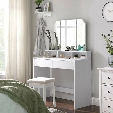 Ce sera votre nouvelle routine : Vous vous réveillez le matin et vous vous asseyez devant cette élégante coiffeuse. Vous trouverez crèmes, fond de teint, fards à paupières, brosses à cheveux et autres accessoires bien organisés dans les 2 grands tiroirs, les 3 compartiments ouverts et sur le niveau surélevé et sur le dessus de table… C’est beaucoup plus pratique, n’est-ce pas ? Comme ça, vous gagner du temps et vous pouvez même vous réveiller plus tard dans la matinée !