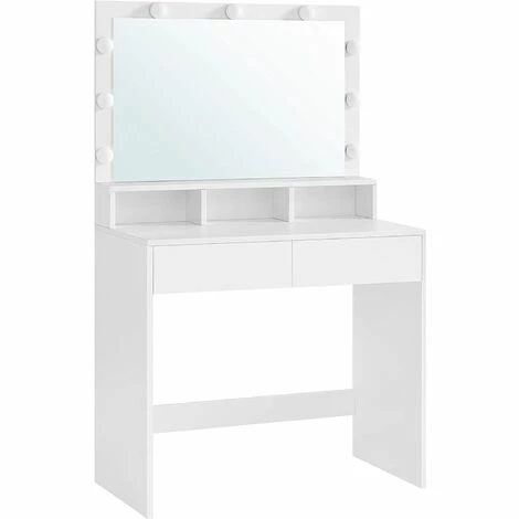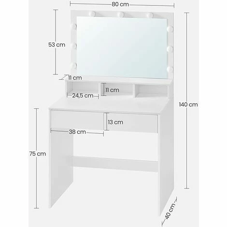 Lumière réglableLe grand miroir avec ampoules LED à luminosité réglable illumine votre espace beauté pour un look parfait ! | Compartiments ouvertsLes 3 compartiments ouverts sont prévus pour ranger vos produits de maquillage. | Avec tiroirsLes 2 tiroirs sont suffisamment spacieux pour ranger différents produits cosmétiques et les protéger de la poussière. |