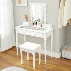Si vous êtes à la recherche d’un cadeau pour votre bien-aimée, cet ensemble de coiffeuse est fait pour vous ! Imaginez comment elle regardera sa tenue dans le miroir accompagné d’un sourire. Avec un blanc élégant et une finition lisse, en voici des détails bien pensés ! Avec cette table de maquillage et ce tabouret, c’est le réel coup de foudre au premier regard assuré !