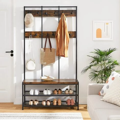 2.Ultra fonctionnel : 12 crochets en 2 rangs (charge statique max par crochet : 2 kg), 2 étagères en treillis pour des chaussures et 1 banc ultra résistant (épaisseur de la tablette : 30 mm) crée un endroit super pratique pour mettre vos chaussures