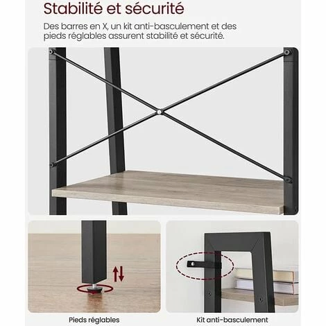 2.Design malin : Cette étagère possède un mélange élégant : un cadre robuste en métal noir, des barres de renforcement en croix et des planches grège. Elle possède de nombreux avantages : aspect original, durabilité remarquable, bonne charge (5 kg/niveau)