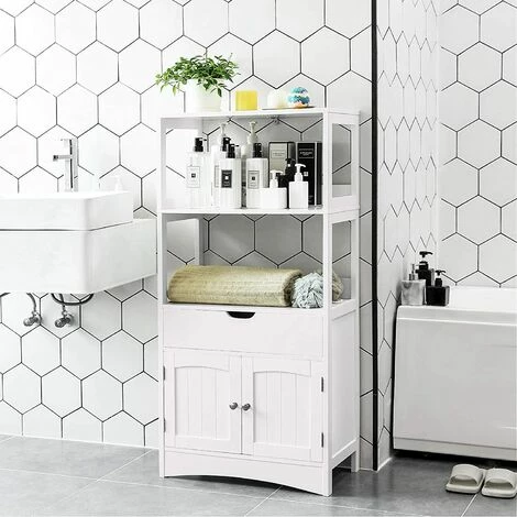 2.DISCRET ET GÉNÉREUX ESPACE DE RANGEMENT : 2 étagères ouvertes prévues pour vos produits de salle de bain. Un tiroir et un placard en bas sont prévus pour des serviettes, du papiers toilette…