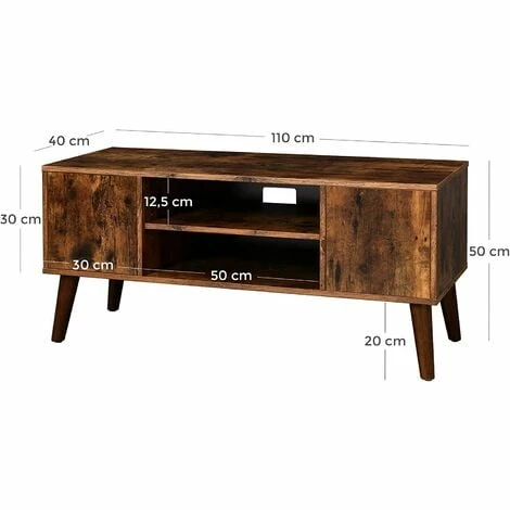 -Ce meuble TV est faite de bois composite de classe E1, sa capacité de charge est de 50 kg. Les pieds inclinés, emblématiques du mobilier rétro, sont fabriqués en bois d’Hévéa pour une excellente stabilité.