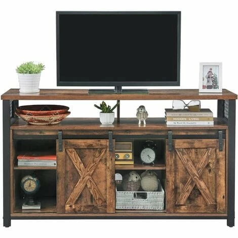 Portes coulissantesLes doubles portes sur coulisse métallique vous permettent d’attraper facilement les objets dont vous avez besoin tout en apportant également une touche de charme à la pièce. | Portes imitation grangeAvec un design en forme de X sur les portes, ce meuble TV ajoute une touche rustique et champêtre à votre espace de divertissement. | Étagère réglableL’étagère du milieu est réglable sur 3 hauteurs, ce qui est parfait pour divers objets, grands ou petits. |