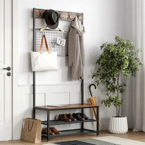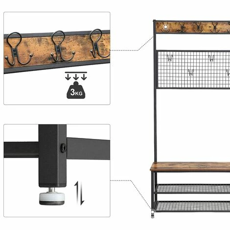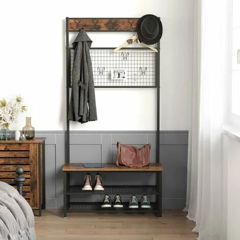 Ce porte-manteau a été conçu avec un banc de rangement, vous offrant un siège confortable avec 2 tablettes en treillis pour ranger vos chaussures. Il dispose également de 9 crochets pour ranger vos clés, sacs ou vêtements. Le panneau grillagé au milieu peut également être utilisé comme galerie photo, pense-bête, présentoir de cartes postales ou organisateur de boucles d’oreilles.