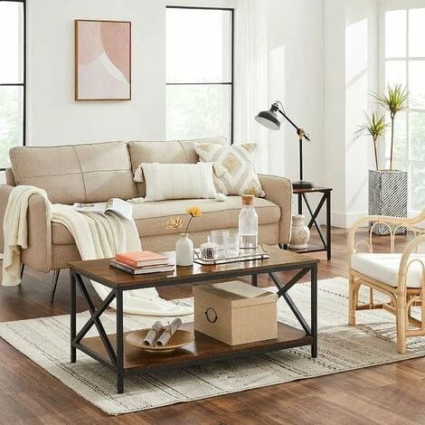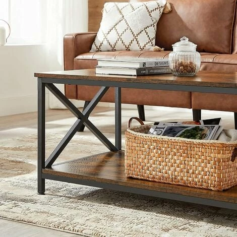1.Ambiance campagnarde : Avec des barres métalliques en X et un mélange bicolore de marron rustique et de noir cette table basse industrielle s’inspire du style campagnard pour créer une ambiance chaleureuse dans votre espace de vie