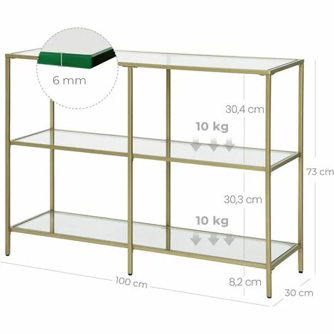 SOUTIEN SOLIDE : Un verre trempé de 6 mm d’épaisseur et un cadre métallique robuste s’unissent comme s’ils étaient faits pour être ensemble. Chaque niveau de cette table console de 100 x 30 x 73 cm (L x l x h) supporte jusqu’à 10 kg, ce qui est parfait pour une collection de livres ou de plantes