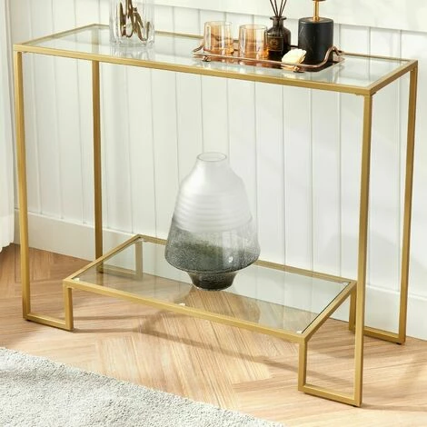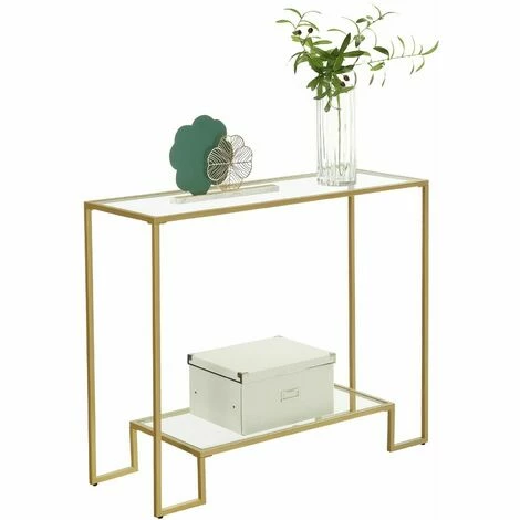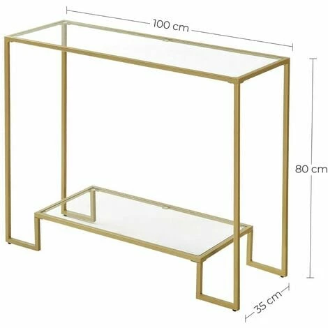 Vous êtes en train de faire la bonne démarche ! Le design original et luxueux de cette table console, son cadre doré en acier robuste et son verre trempé transparent va faire fureur chez vous. Profitez des 2 étagères pour placer des décorations et les faire briller encore plus !